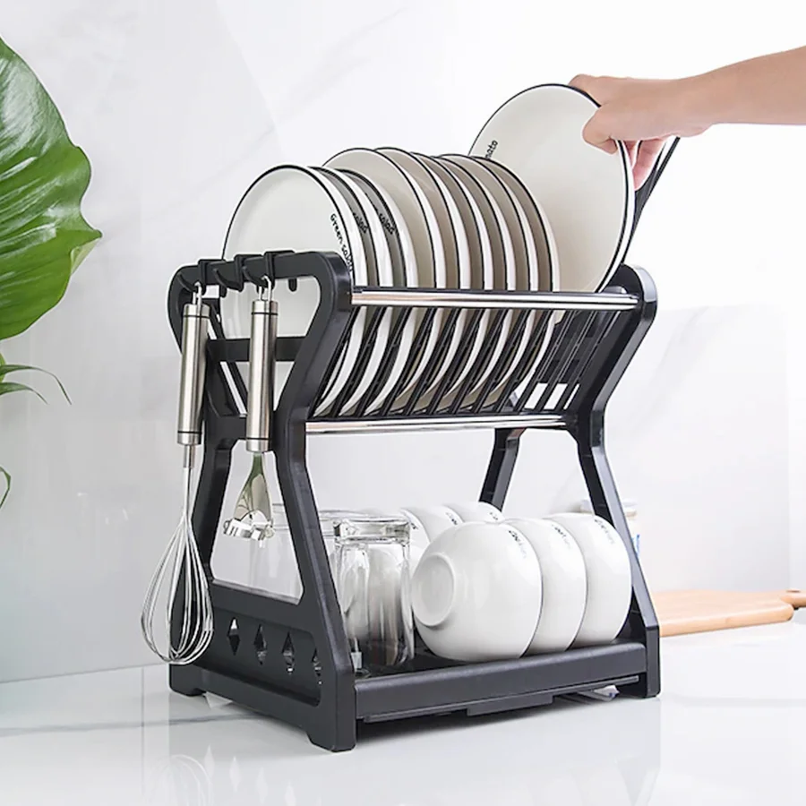 Keep your kitchen counter clean and organized with the Double Layer Dish Drying Rack, A sleek and functional solution designed for modern homes. Built for efficiency and style, This Dish Drainer lets you dry, store, and organize your tableware all in one place. Its Two Tier structure maximizes space, giving you a dedicated section for plates on the top and a wide lower rack for bowls, glasses, and mugs. The included Cutlery Holder neatly stores forks, knives, and spoons, while The Side Utensil Hooks are perfect for hanging whisks or ladles. Whether you have a compact kitchen or a spacious one, this rack helps you maintain a clutter free countertop with ease.