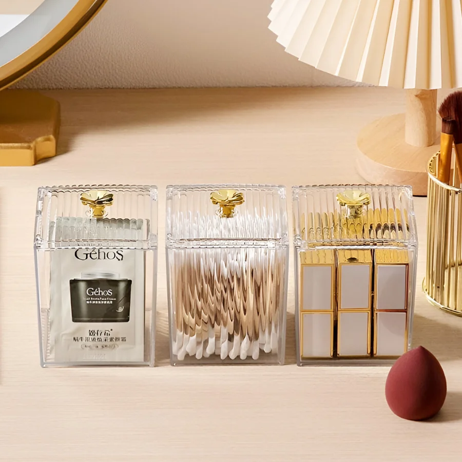 The Ribbed Cube Design paired with a Gold Lid gives it a sophisticated touch that elevates any vanity or countertop. Perfect for holding Cotton Pads, Cotton Swabs, Lipsticks, Makeup Sponges, or Small Skincare Items, it keeps your essentials tidy and accessible. Its compact yet roomy design fits effortlessly on bathroom counters, bedside tables, or office desks wherever you need a little organized elegance. Made with durable, crystal-clear acrylic, this cube is easy to clean and built to last. The transparent structure ensures everything is visible at a glance, saving time while adding a touch of luxury to your space. Whether you use it to store beauty accessories or daily essentials, it keeps things simple, clean, and beautifully displayed.